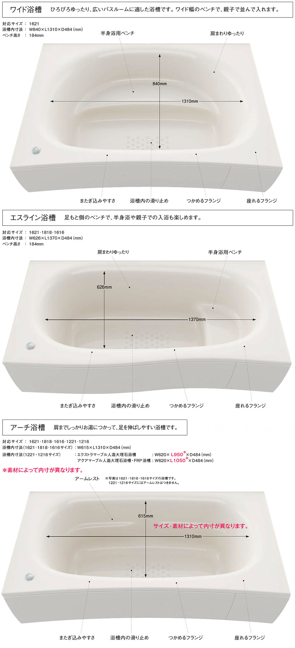 3種類の浴槽形状。スタイリッシュな浴室を演出します。